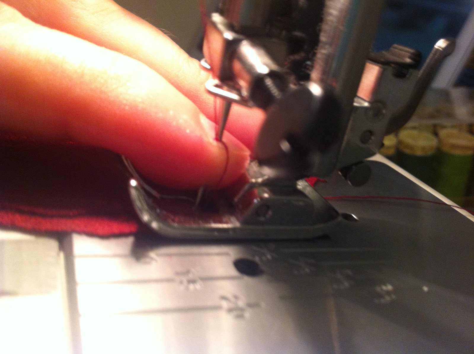 So now that I smothered you with cute pictures, here come the gory ones. So...true story. I sewed myself into my sewing machine while working on this project. Yup, needle right through my finger. Directly into the nail and out the other side. This happened at 9:30 pm on a night when James was out of town on a business trip. THANK GOODNESS I had my cell phone close enough to me (I was literally attached to the machine, there was no getting out of it on my own!) to call my sister-in-law, Mandy who lives next door to come rescue me. And mind you, at this time, Mandy was 38 weeks pregnant and my brother Curt, a pilot, was working and wasn't home either. Once the initial shock of the situation wore off and panic set in, I literally began to sweat. Really bad. And cry a little too, because well, it hurt pretty bad. Mandy helped me extract myself from the machine, which in retrospect was really the worst part of the whole event. Once we saw what we were dealing with we decided it was going to take a trip to the ER to get the needle out. So there we were, two pregnant ladies with two sleepy kiddos in tow, waddling into the ER at 10:30 at night. The good thing about being pregnant and having a sharp object stuck in you is that they get you in to be seen right away so we didn't have to wait long. They numbed my finger and then yanked the needle out. Blood. Yeesh. I'm fine now. After a round of antibiotics to rule out infection and a month or so of having a numb fingertip, my finger is no worse for the wear. Still, it's a pretty good story, don't you think? When she gets old enough, I'll have to tell our daughter exactly what went into making those dolls for her!